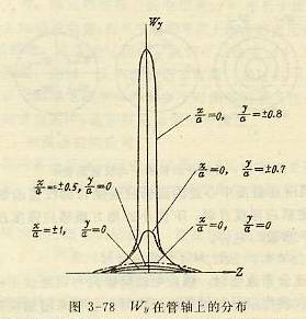 圖3-78是管軸方向上Wy的分布情況。從圖中可知,Wy值隨著離開(kāi)電極所在截面距離(z)的增大而迅速衰減,當(dāng)距離z>0.25D時(shí)實(shí)際上達(dá)到零。這說(shuō)明在離電極平面較遠(yuǎn)處的管內(nèi)空間,流體產(chǎn)生的感應(yīng)電勢(shì)對(duì)電極上的輸出信號(hào)基本上沒(méi)有什么貢獻(xiàn),因此可以把變送器的磁場(chǎng)縮短,從而使整個(gè)變送器的長(zhǎng)度和體積大大縮小,重量減輕。例如,φ100mm的變送器,原來(lái)根據(jù)均勻磁場(chǎng)原理設(shè)計(jì),要求磁場(chǎng)均勻,線圈軸向長(zhǎng)度為2.5~3D,整個(gè)變送器的長(zhǎng)度為610mm,現(xiàn)根據(jù)W函數(shù)分布制成的非均勻型變送器,長(zhǎng)度僅為300mm。